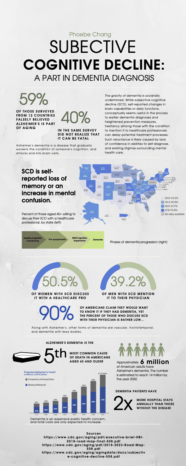 For CHEM 162, we were assigned final projects where we could choose from an approved list of topics. Using online resources to create an infographic about Subjective Cognitive Decline (SCD) was an appealing route for me due to family members falling victim to dementia. I wish I’d been aware of the information I found when they were first diagnosed because the statistics indicate its commonality, and I would’ve felt slightly less burdened or isolated in the struggle to care for them. The full resource also mentions treatment/support options for those affected (not exclusive to diagnosed patients). See more below: